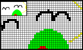 Die (stark vergrößerte) Beispiel-Grafik zeigt die Darstellung der einzelne Bildpunkte, während das Bild in der linken oberen Ecke kleiner zu sehen ist: